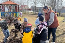 , прогулочные участки освободились от снега, подсохли, появилась возможность с ребятами убрать прошлогоднюю листву, упавшие веточки. Такому нужному и полезному делу были рады все!