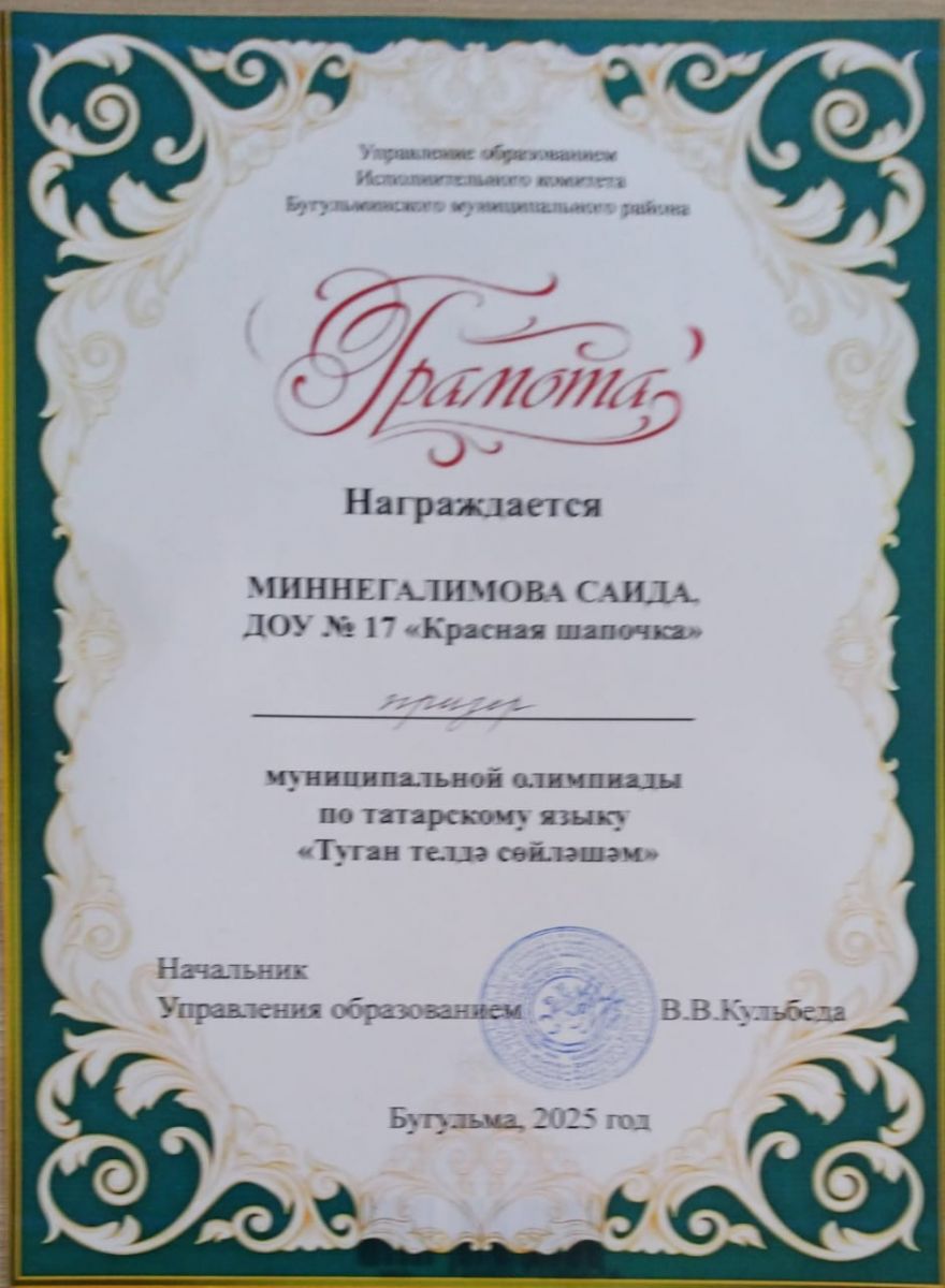 Сегодня в ДОУ N2 "Батыр" состоялась муниципальная олимпиада по татарскому языку " Туган телдə coйлəшəм". Поздравляем нашу воспитанницу Миннигалимову Саиду и воспитателя по татарскому языку Низматзянову Г.С. с заслуженной победой " Призер" . Так держать! Молодцы!