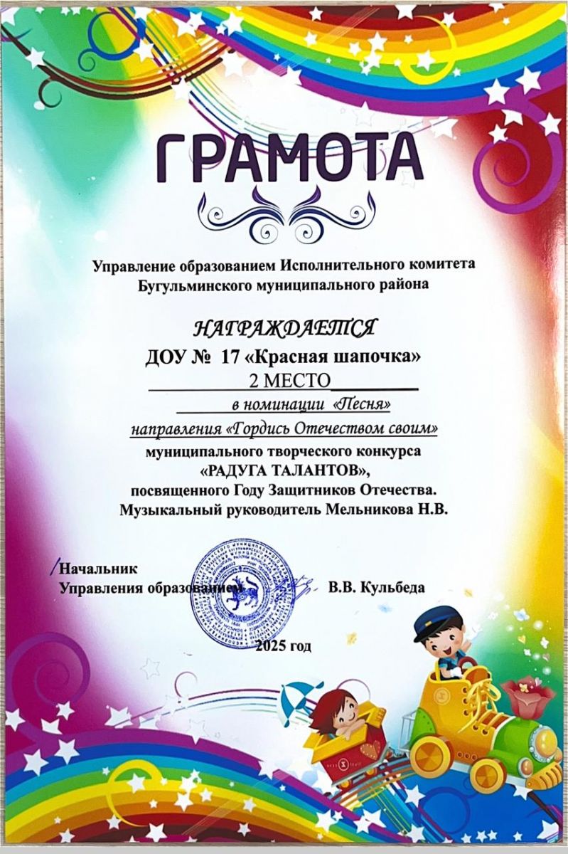 Поздравляем Алексанину Софию со 2 местом в муниципальном творческом конкурсе « Радуга талантов» в номинации « Песня», посвященного Году защитников Отечества. Желаем дальнейших творческих успехов и побед! -