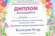 21 февраля, в нашем детском саду был проведен первый (отборочный) тур олимпиады по русскому языку, по итогам которого, на городской (второй) этап был выбран воспитанник подготовительной группы Коледин Егор и стал призёром городской олимпиады дошкольников по русскому языку «Занимательная грамматика». Коллектив ДОУ поздравляет Егора с победой и желает ему дальнейших достижений. Умничка!