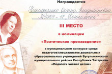 Поздравляем Никифоренко Оксану Владимировну с 3 местом в номинации "Поэтическое произведение" в муниципальном конкурсе среди педагогов дошкольных образовательных учреждений Бугульминского муниципального района Республики Татарстан "Педагоги читают детям"