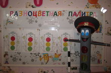 С раннего возраста воспитанники уже знакомятся с правилами дорожного движения. С целью воспитания навыков выполнения основных правил поведения детей на улице, дороге, предупреждения детского дорожно – транспортного травматизма в младшей группе была проведена игра «Светофор» с использованием модели светофора. К малышам пришел необычный гость – Светофор. Ребята с удовольствием его рассмотрели, примерили настоящую фуражку полицейского, искали потерявшиеся цвета. А в завершении дети выполнили коллективную работу «Светофор».
