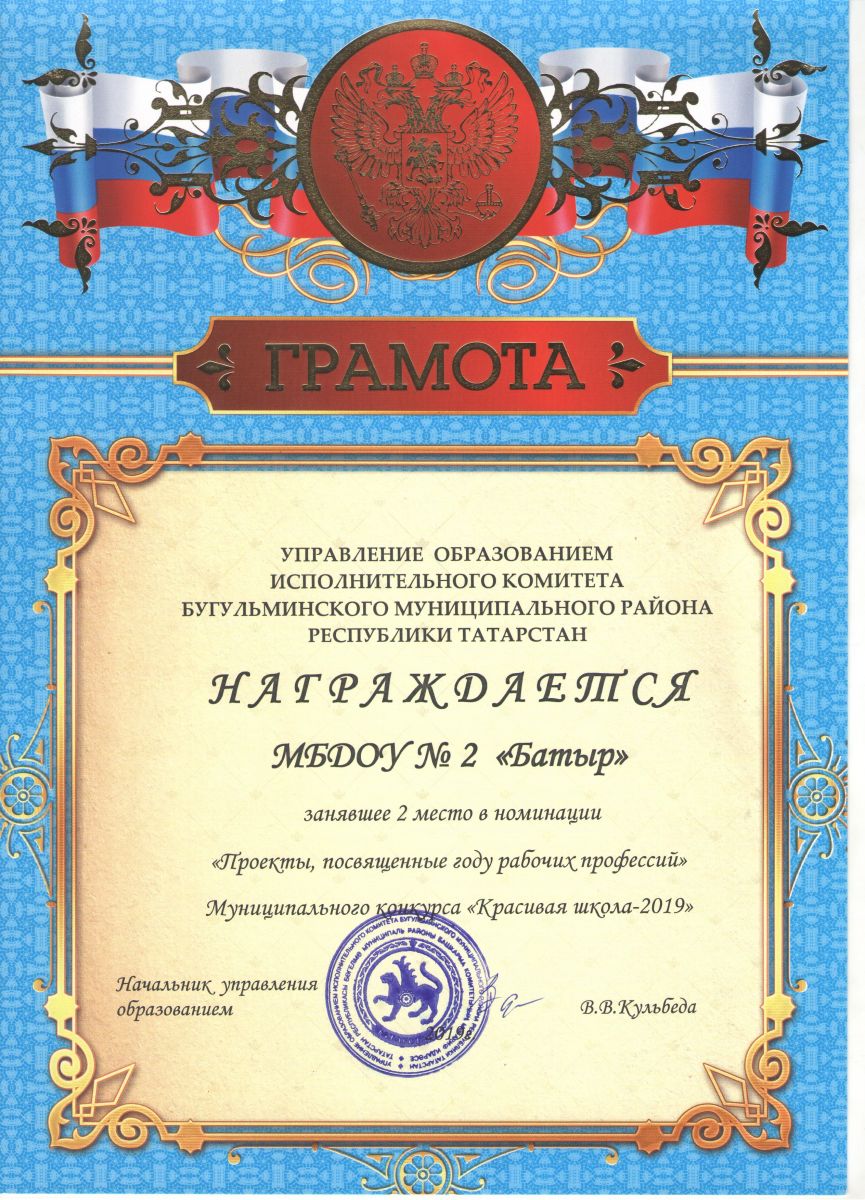 Һөнәри юнәлеш бирү-мәктәпкәчә белем бирү өчен чагыштырмача яңа төшенчә. Балаларны һөнәри эшчәнлекнең төп төрләре белән таныштыру өчен бик күп алымнар кулланыла. Тәрбиячеләр әдәбиятны җәлеп итәләр: шигырьләр, табышмаклар, әйтемнәр укыйлар, гамәли материал, уен-квестлар кулланалар. Һәм без эш тәҗрибәбезне «Матур мәктәп-2019» муниципаль конкурсында тәкъдим иттек. Анда без «Һөнәрләр елына багышланган проектлар» номинациясендә 2 нче урын алдык.