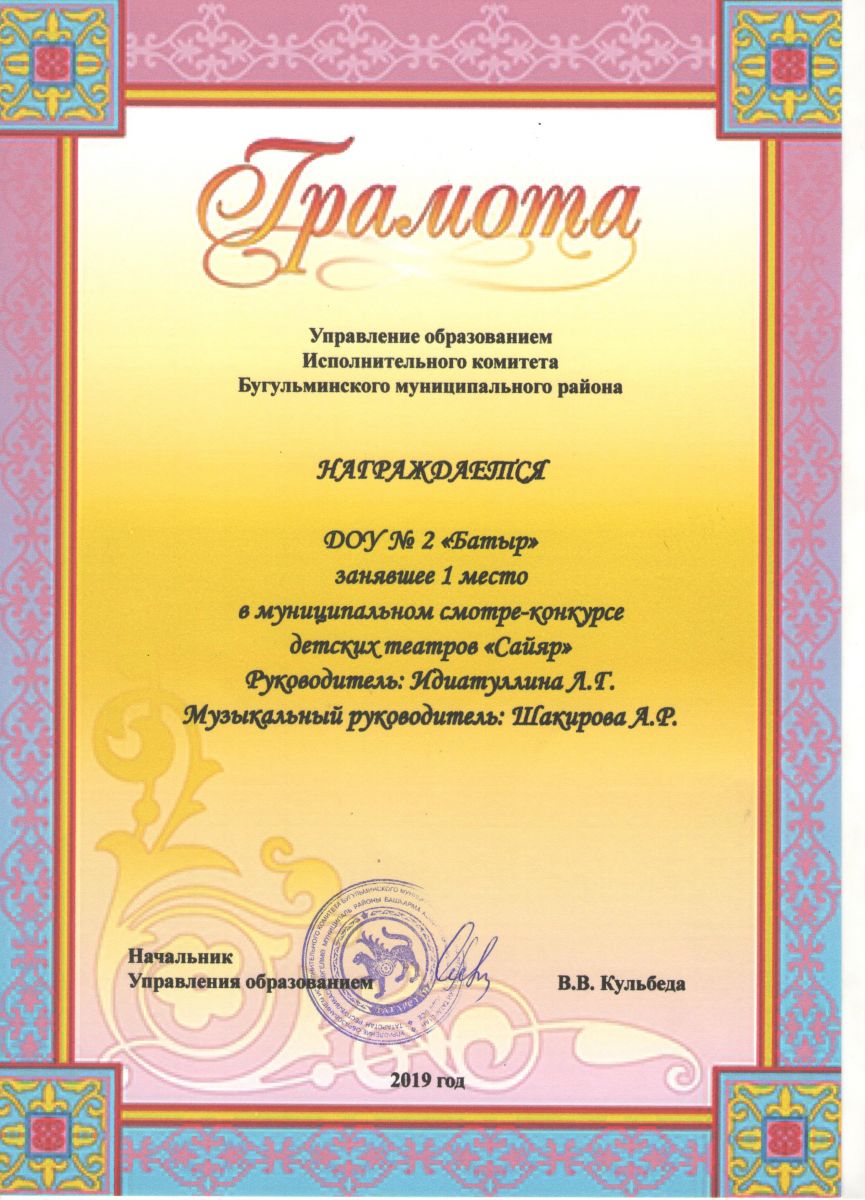 “Батыр” балалар бакчасының мәктәпкә әзерлек төркеме «Сәхнә» дип исемләнгән муниципаль бәйгедә Нәфидә Хәкимованың “Әни була бер генә – кадерләрен бел генә” дип исемләнгән әсәр белән катнашып беренче урынга лаек булдылар. Балалар үз рольләрен бик матур итеп уйнады. Төп рольләрне башкаручылар: әни – Галиева Мәликә, малай – Набиуллин Марсель, куян – Валеева Адилә, төлке – Габдрахманова Диләрә, тиен – Асылгареева Сабина, аю – Грушина Илария, бүре – Яковлева Кристина мәктәпкә әзерлек төркеме балалары. Театрны сәхнәгә куючы мәктәпкә әзерлек төркеменең тәрбиячесе Идиатуллина Лилия Гаяз кызы әйтүенчә, балалар үзләрен чын артистлар кебек тоттылар.
