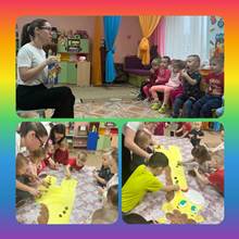 В рамках взаимопосещения ОД 16.11.2023 в первой младшей татарской группе № 1(4) прошло открытое занятие по художественно-эстетическому развитию-рисование в нетрадиционной технике "Пятнышки для жирафа". Малыши познакомились с жителем Африки- жирафом, который по пути к ребятам растерял все свои пятна. Ребята решили помочь гостю и нарисовать ему новые пятнышки. Воспитанники под руководством воспитателя Нуреевой Л. Х. освоили новую технику- примакивание губкой. Малыши работали увлеченно, с интересом и старанием, результатом чего явились новые пятнышки на жирафе. -