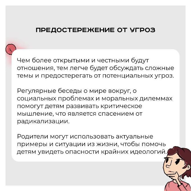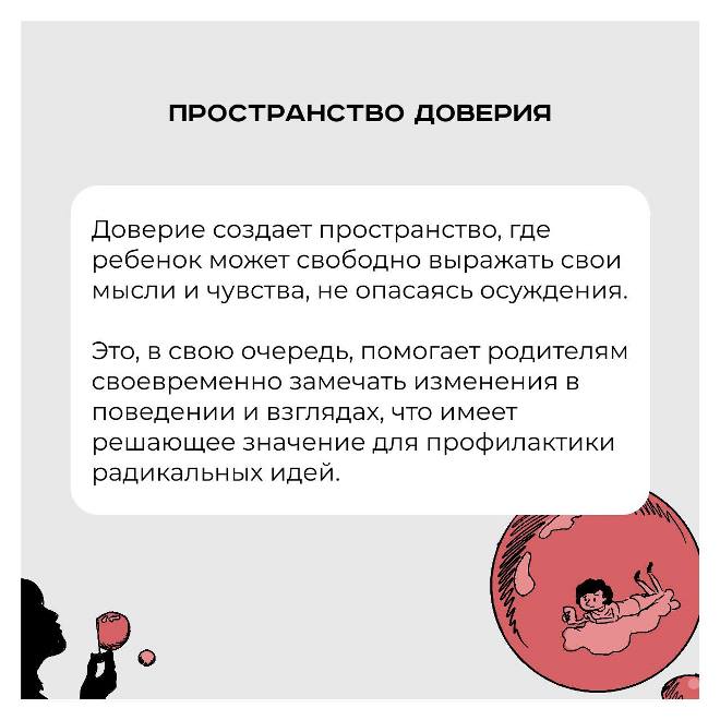 В условиях, когда радикальные идеи могут легко проникать в умы подростков, доверительный диалог становится ключевым элементом, позволяющим обсуждать сложные темы, выявлять тревожные изменения в поведении и противостоять возможному влиянию экстремистских взглядов.