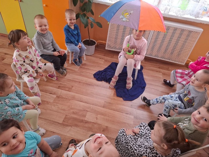 Зайчик попал под дождь и ребята вытерли его насухо, чтобы он не простудился. Мишку сначала уронили, а после пожалели и погладили. Вместе с Таней поиграли в мяч. Лошадке причесали ее красивую гриву. Бычок научил наших малышей ходить по доске.