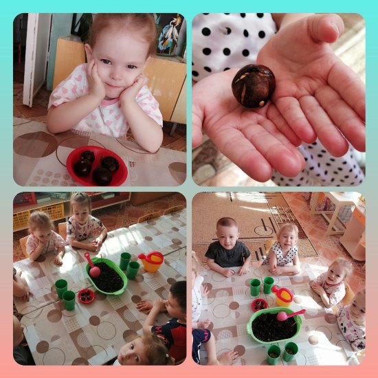 Во время прогулки ребята увидели незнакомые шарики - семена каштана, из которых решили вырастить свои собственные саженцы этого необычного дерева. Усилия ребят и взрослых дали свои результаты - плоды ожили и пустили маленький росток! Малыши с удовольствием погрузилась в процесс посадки пророщенных семян каштана, они научились замачивать семена, насыпать и утрамбовывать грунт в посадочном стакане, аккуратно поливать и укрывать посадки.