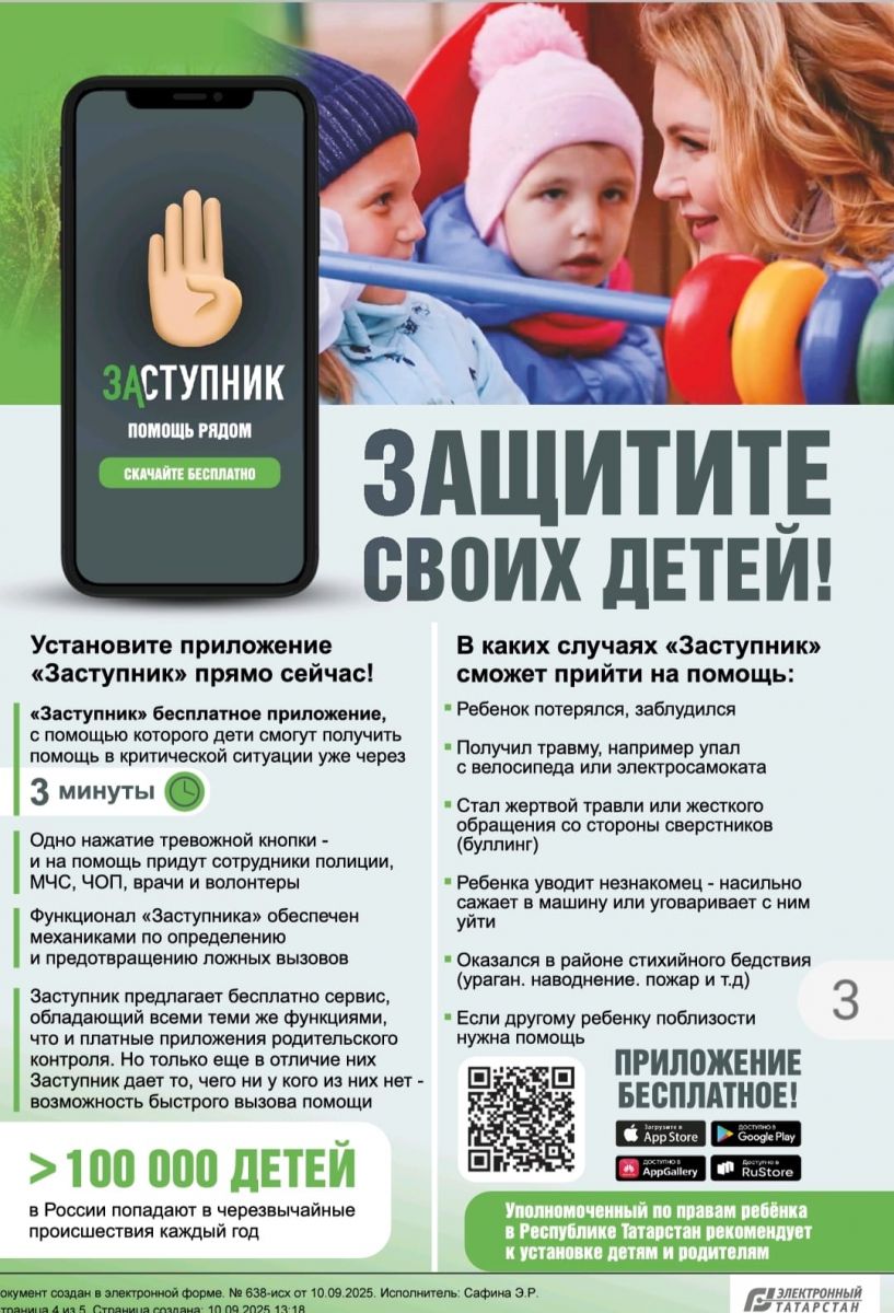 Уважаемые родители! По инициативе Уполномоченного по правам ребёнка Ирины Волынец при поддержке Раиса Татарстана Рустама Минниханова в республике запущен проект по содействию детской безопасности «Заступник». Предлагаем Вам бесплатно установить мобильное приложение “Заступник”, которое, в отличие от многочисленных приложений родительского контроля, позволяет реб`нку не только послать сигнал бедствия в экстренной ситуации, но и, что более важно, получить помощь экстренных служб и волонтеров в невероятно короткий срок — всего от трёх минут.