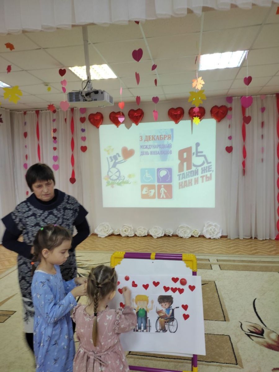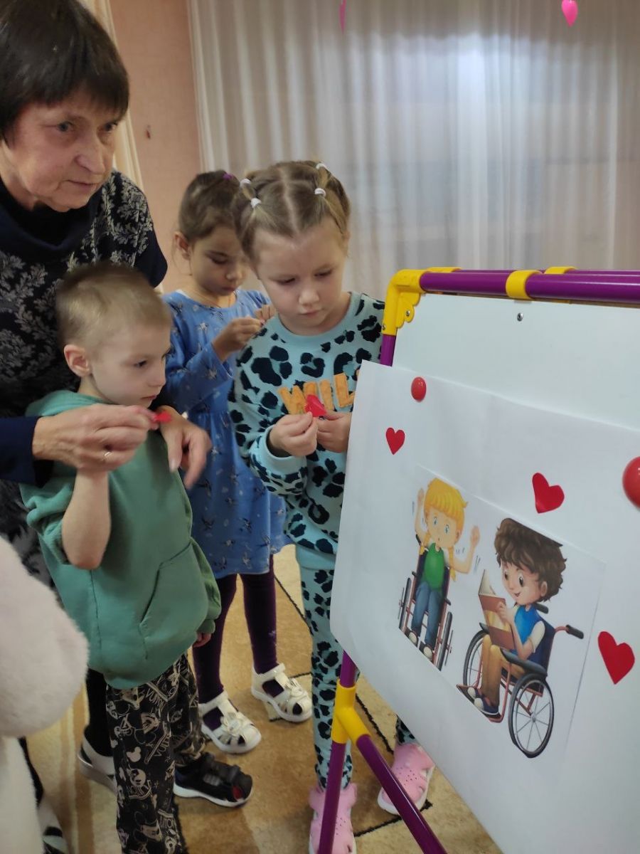 Педагоги с ребятами вспомнили о тех, кто нуждается в поддержке, но обладает сильным характером и талантом. Они узнали о людях, которые достигают успехов в профессии, искусстве и спорте, несмотря на трудности. Затем дети посмотрели мультфильм «Цветик-семицветик» (по мотивам сказки В. Катаева), обсудили поступки героев и поделились своими впечатлениями. Ещё дети раскрасили раскраски по теме дня.