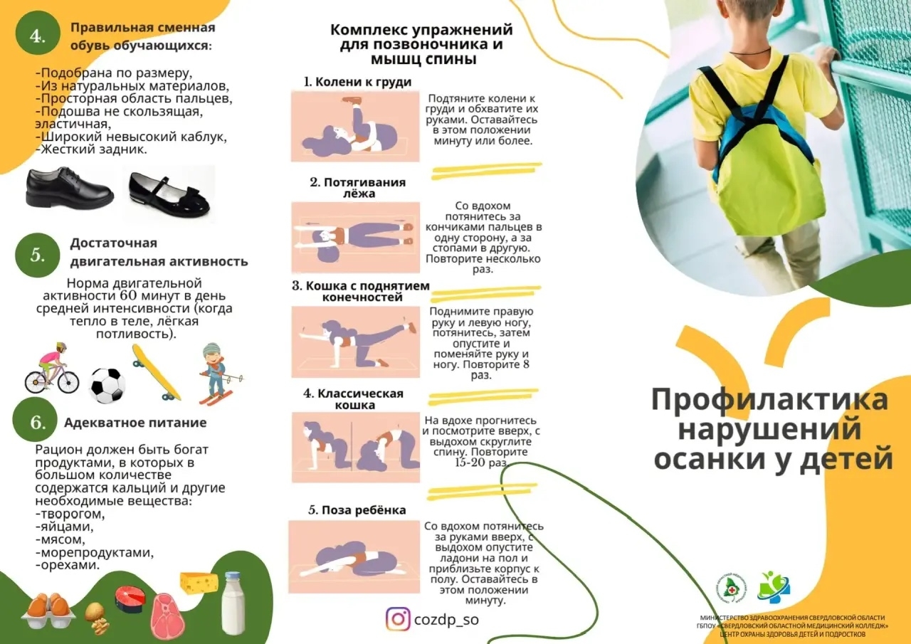 Профилактика нарушений осанки у детей включает организацию ортопедически правильного спального и рабочего места, регулярную физическую активность (плавание, ЛФК, игры), сбалансированное питание для укрепления мышечного корсета и контроль за осанкой при сидении. Важно носить рюкзаки, а не сумки, делать перерывы при занятиях за столом и проходить осмотры у ортопеда.