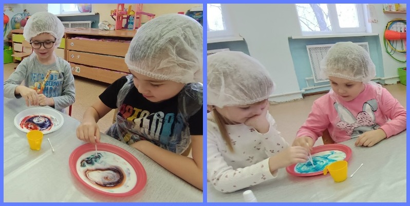 В старшей группе прошёл час науки. Ребята провели эксперимент с молоком, красками с целью — выяснить свойства молока при взаимодействии с красками и жидким моющим средством. Далее... -