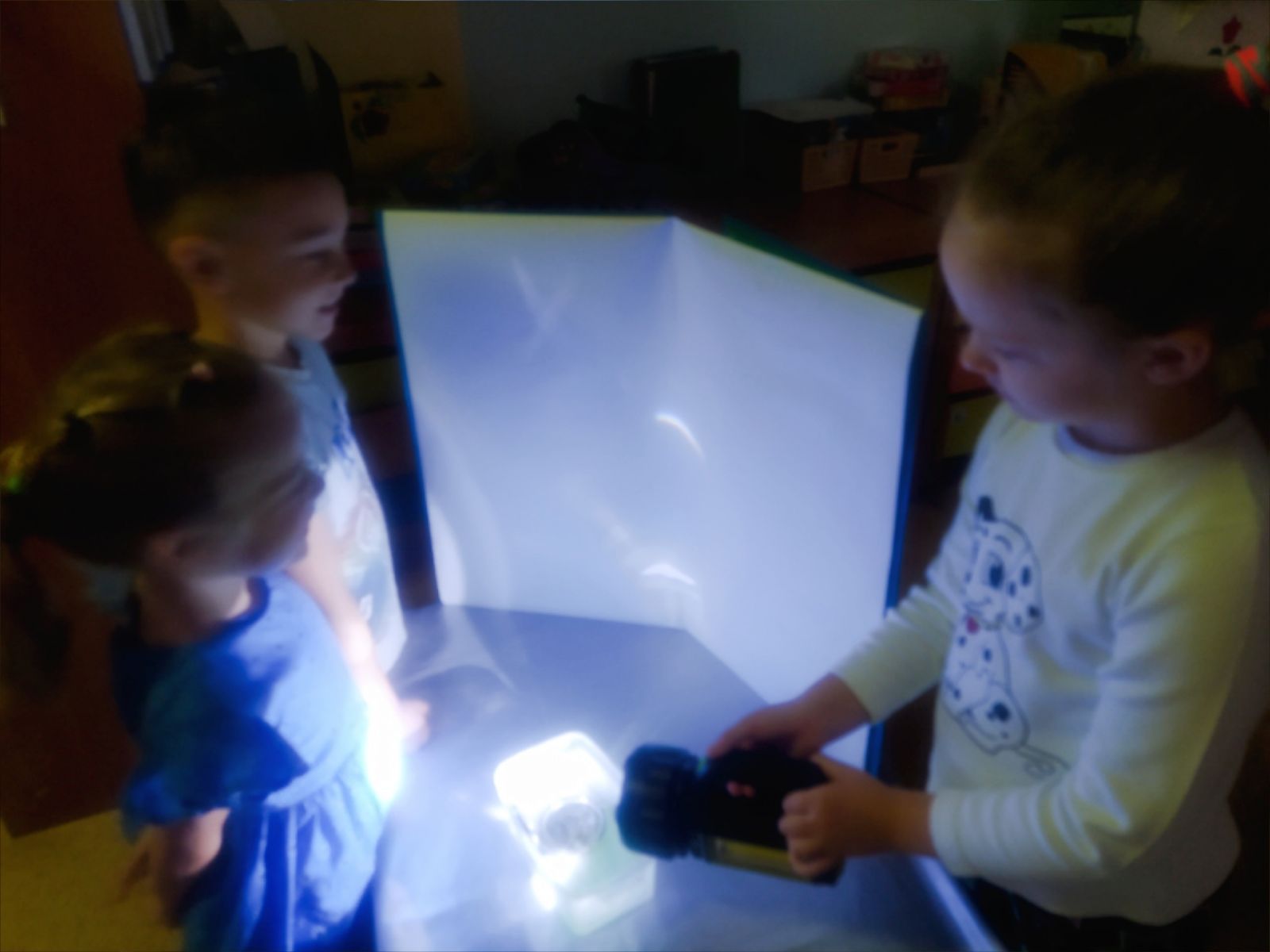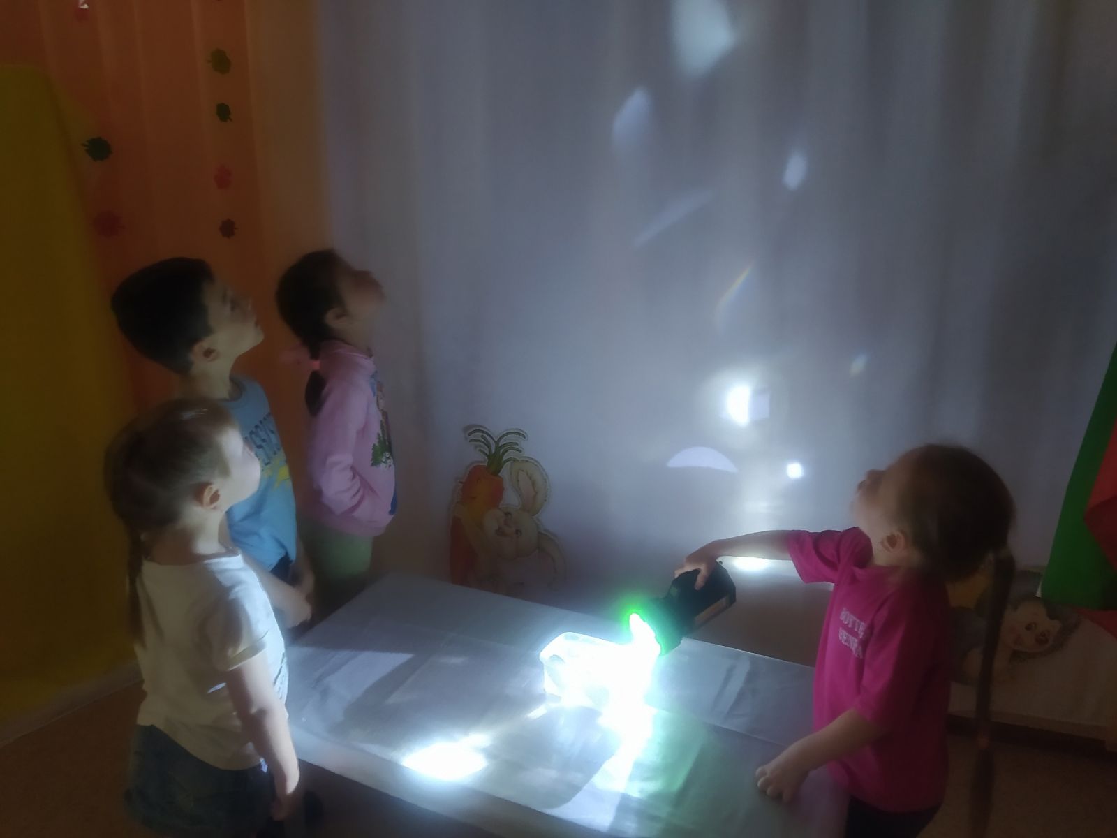 В старшей группе нашего детского сада провели эксперимент "Радуга в темноте". Дети знакомились с радугой, как природным явлением; раскрыли причину её появления (отражение, преломление и разложение солнечного света) .