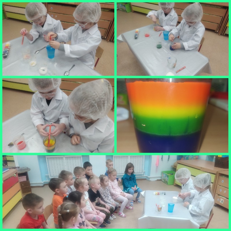Опубликовано: 22.11.2024В старшей группе провели опыт "Радуга в стакане". Цель: познакомить детей со свойством воды — плотность. Размешав разное количество сахара в четырёх стаканах воды и аккуратно, по очереди, заливая полученную воду в один стакан, мы получаем воду, разделившуюся на слои. В чем же секрет? Концентрация сахара в каждой раскрашенной воде была разной. Чем больше сахара, тем выше плотность воды и тем ниже этот слой будет с стакане. Жидкость с наименьшим содержанием сахара, а соответственно, с наименьшей плотностью окажется на самом верху.