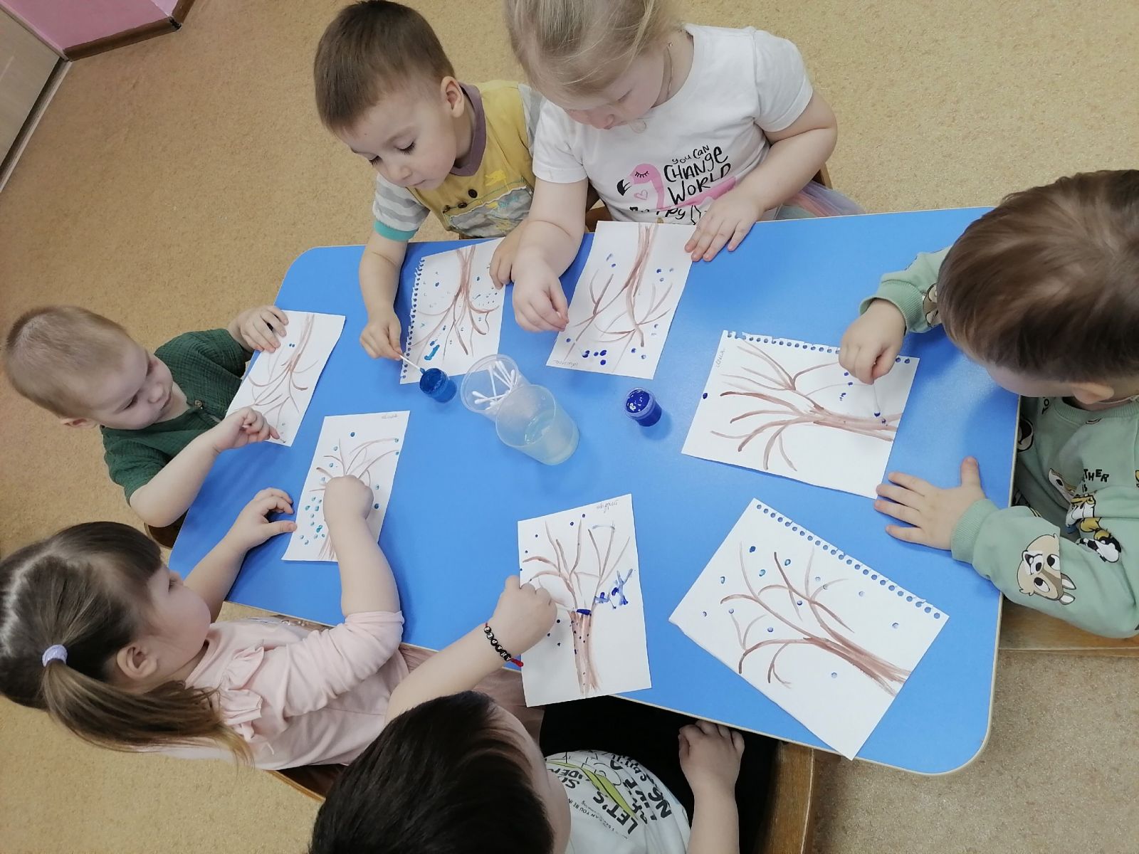 Сегодня наши малыши рисовали ватными палочками хлопья снега. Посмотрите, какие рисунки у ребят!