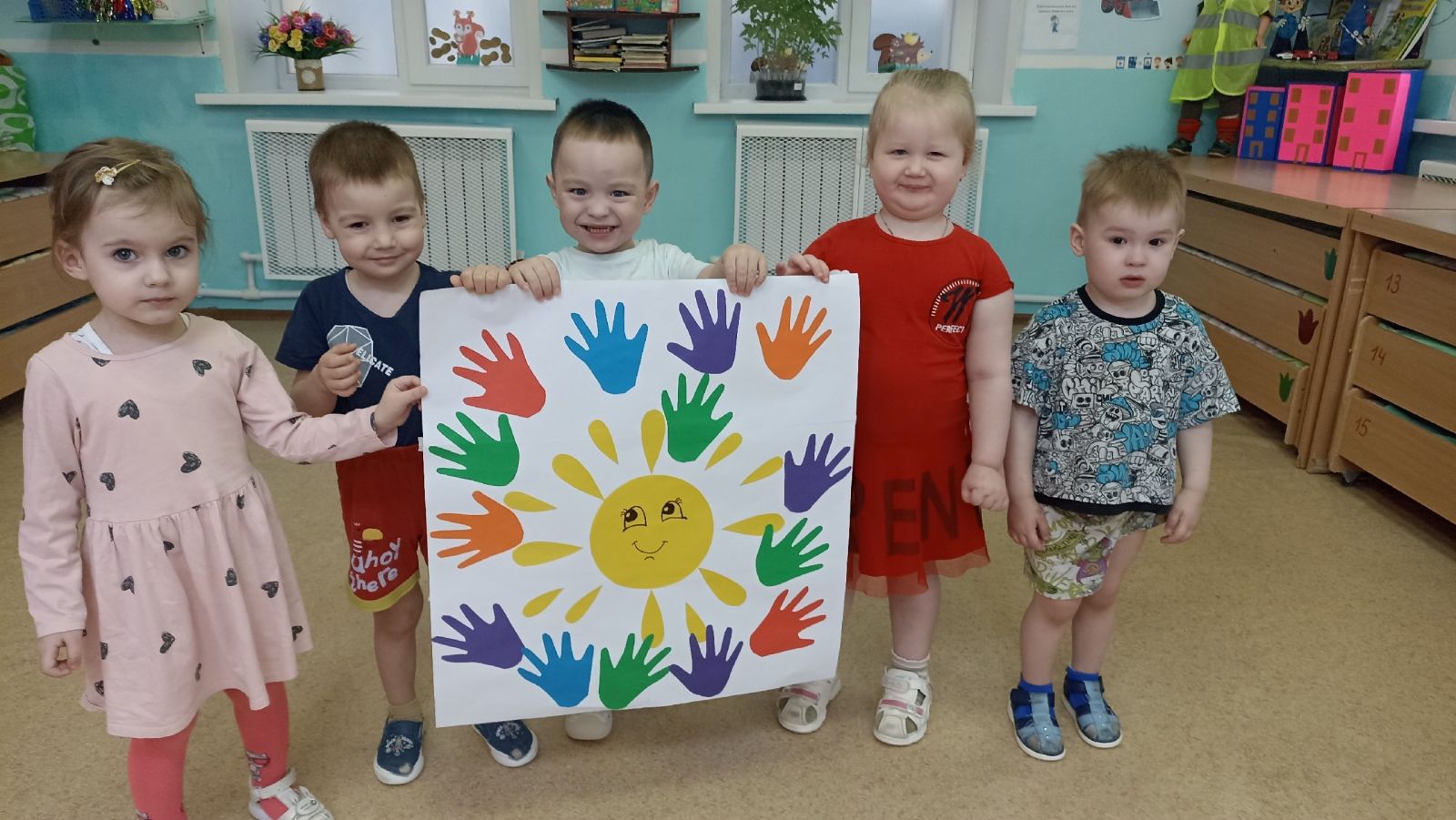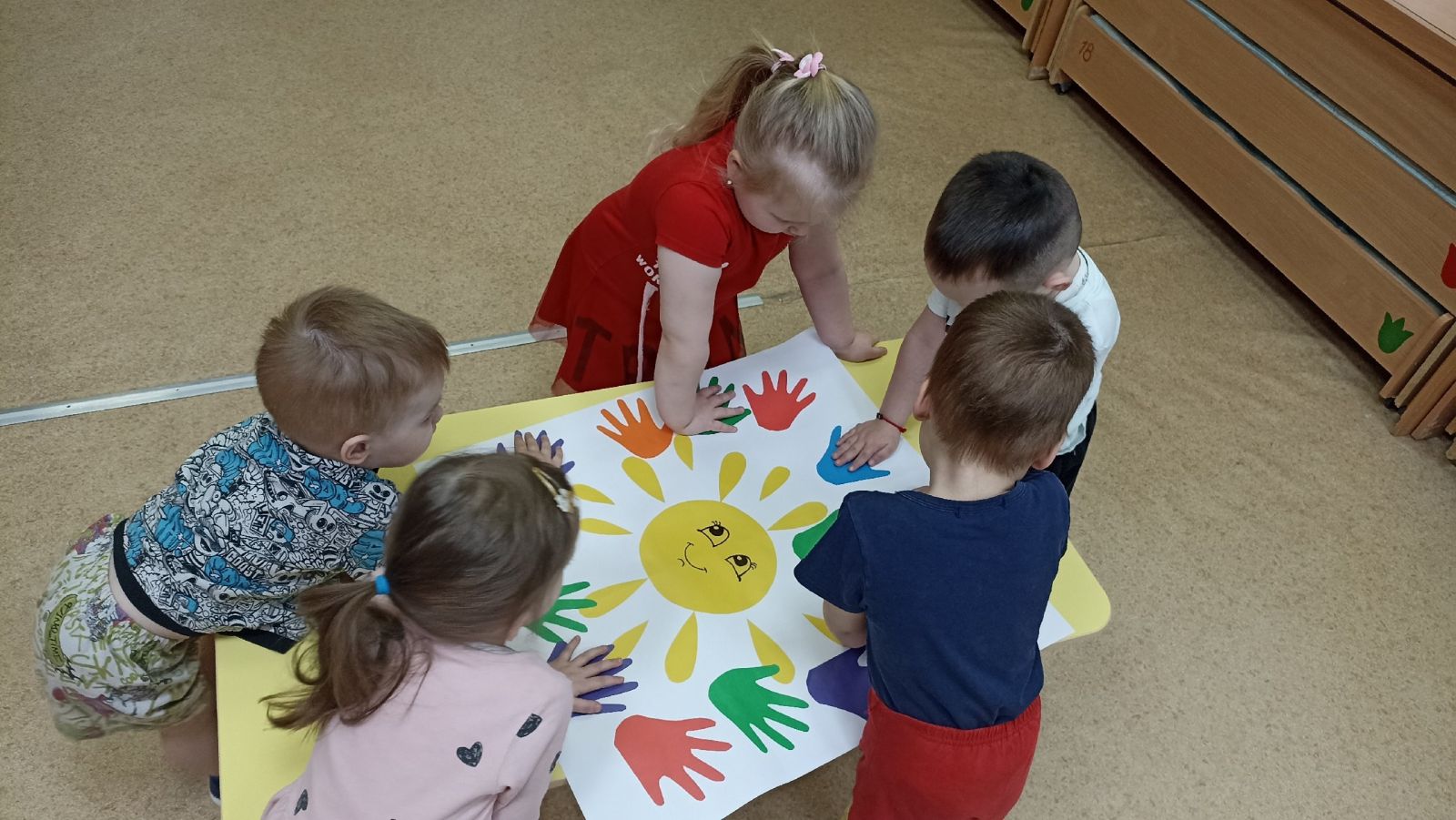 24.04.2025 г. В рамках Недели психологии, с целью развития эмоциональной сферы воспитанников в первой младшей группе "Кояшкай" было проведено занятие «Цветонастроение» (аппликация из ладошек). Плакат "Цветонастроения" получился ярким, солнечным и добрым, как и настроение наших ребятишек!