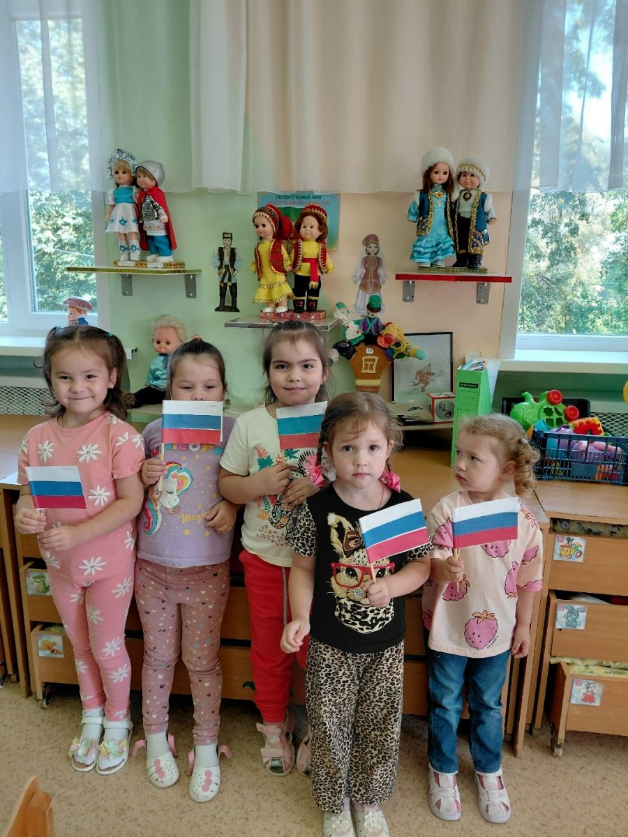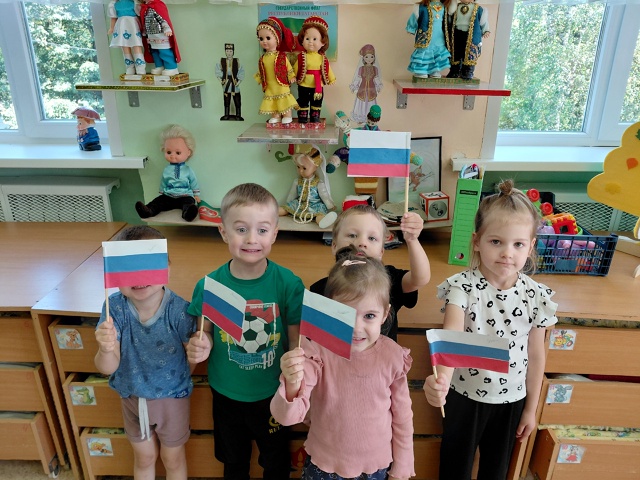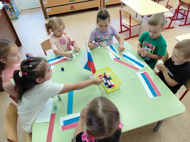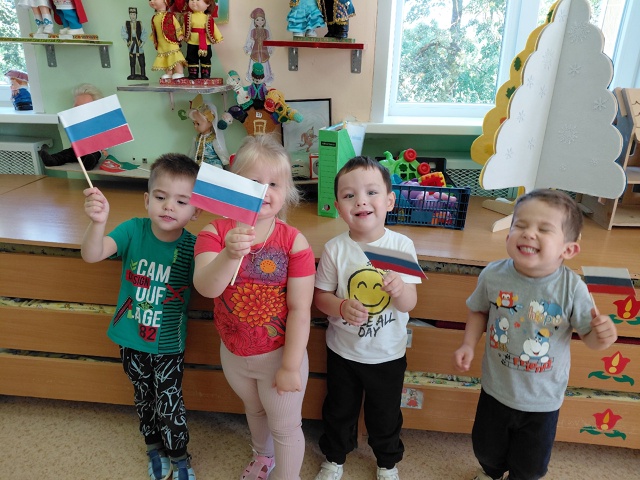 "Гномики" төркемдә тәрбияләнүчеләр бу көнне Россия символы, аның тарихы турында әңгәмәдән башладылар. Аннары балалар "Россия флагы" аппликациясен үтәделәр. Хәзер һәр баланың өендә үз куллары белән ясалган яраткан Ватаныбыз флагы булачак.