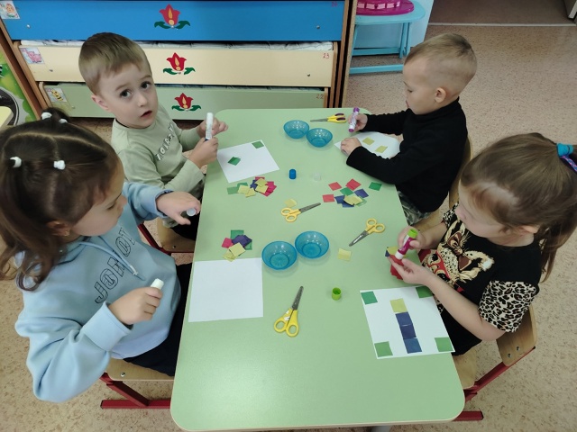 На занятии по аппликации наши малыши из средней группы "Гномики" превратились в настоящих дизайнеров! Ребята учились создавать узоры из геометрических фигур на прямоугольной основе.