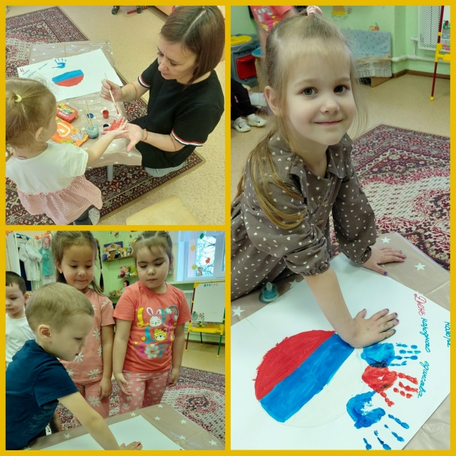Дошколята прослушали гимн нашей великой страны, познакомились с флагом России. Завершением мероприятия стала аппликация "Флаг России!".