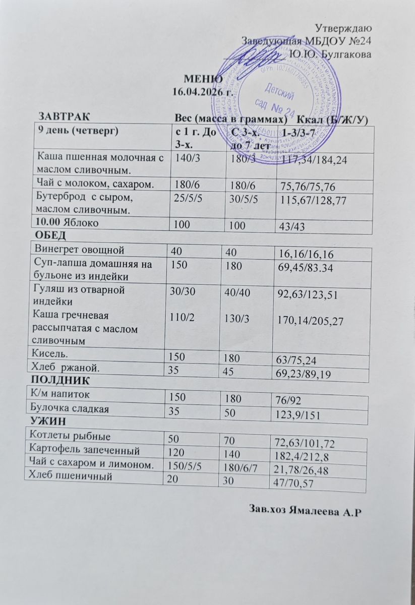 Питание осуществляется в соответствии с меню, утверждённым Заведующей Учреждением и старшей медицинской сестрой. Режим и кратность питания воспитанников и обучающихся устанавливаются в соответствии с деятельностью их пребывания в Учреждении и рекомендациями органов здравоохранения.