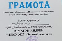 Поздравляем воспитанника подготовительной к школе группы N1 Юматова Андрея, победителя в городской олимпиаде по ИКТ "Квантик"!