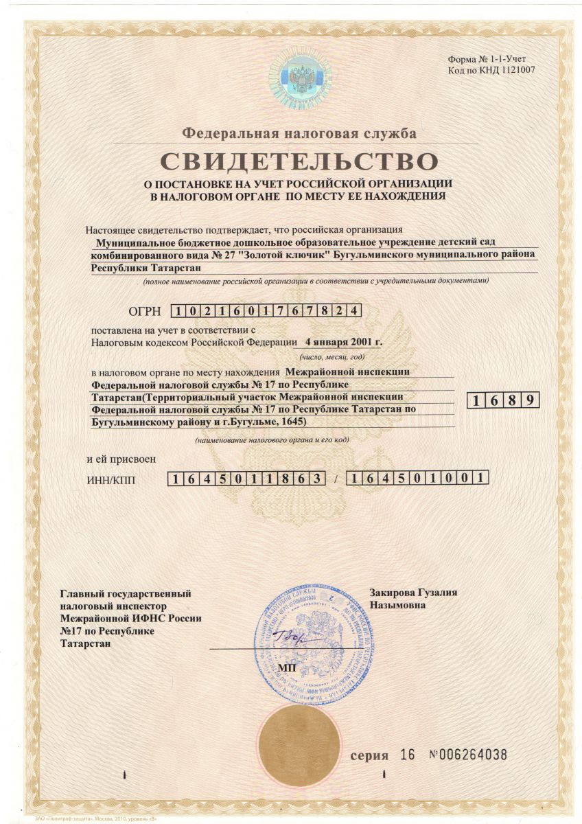 Свидетельство о постановке на учет Российской организации в налоговый орган