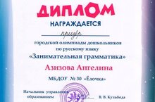 Поздравляем нашу умницу, Азизову Ангелину с призовым местом в городской олимпиаде дошкольников по русскому языку «Занимательная грамматика».