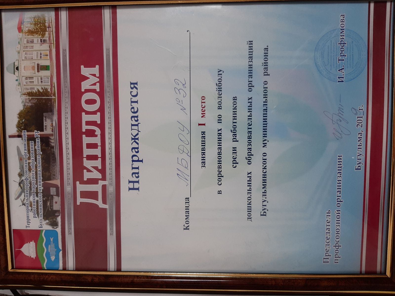 Диплом Победителя 1 место в соревнованиях по волейболу среди работников дошкольных образовательных организаций БМР-2019г.