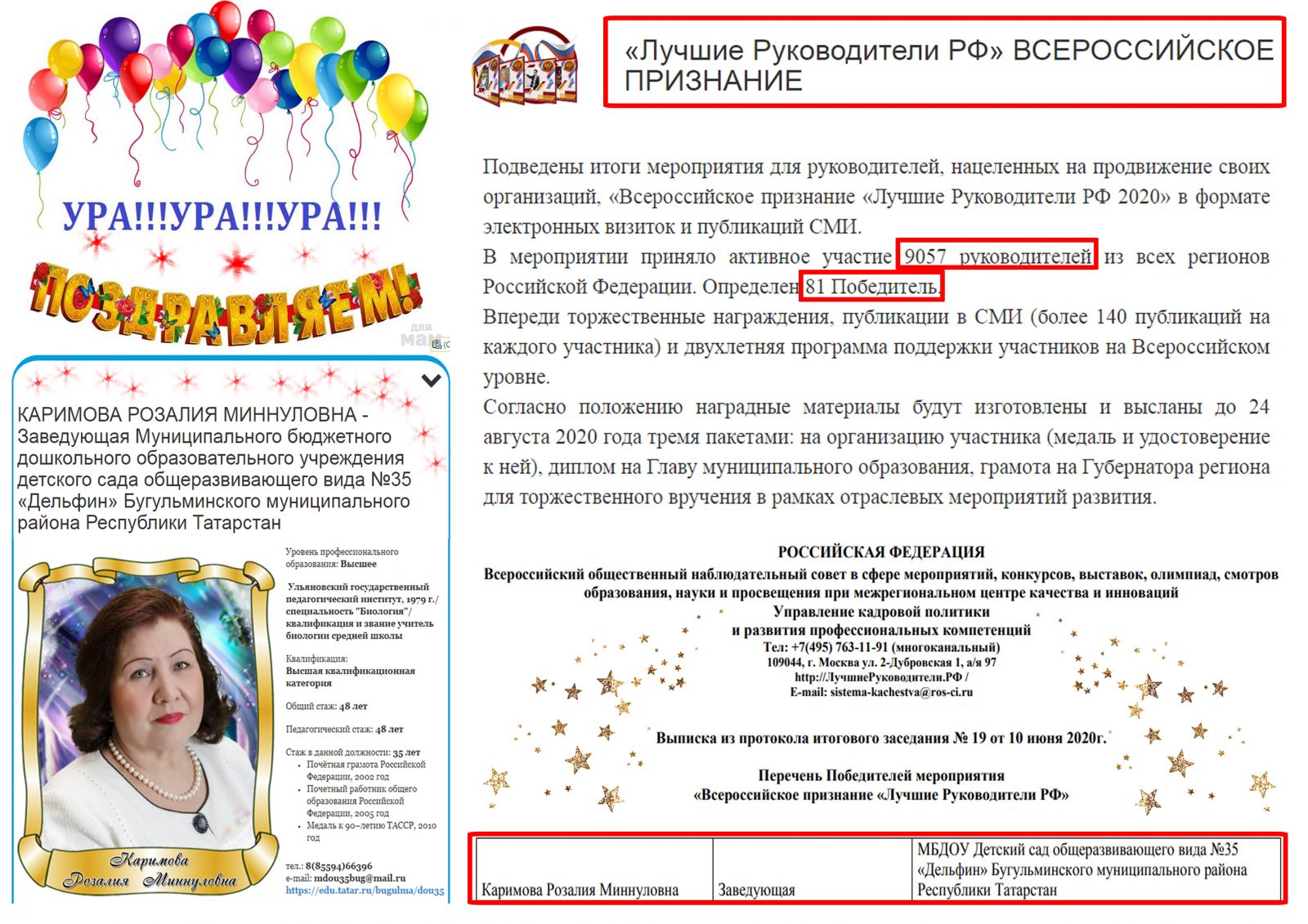 Подведены итоги мероприятия для руководителей, нацеленных на продвижение своих организаций, «Всероссийское признание «Лучшие Руководители РФ 2020» в формате электронных визиток и публикаций СМИ. В мероприятии приняло активное участие 9057 руководителей из всех регионов Российской Федерации. Определен 81 Победитель. И наш руководитель Каримова Розалия Миннуловна вошла в число Победителей. ПОЗДРАВЛЯЕМ!!! УРА!!!
