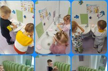 Дети младшей группы приучаются следить за своим внешним видом. Воспитатели формируют умение у детей закатывать рукава, мыть ручки, пользоваться мылом. Воспитывают стремление у детей к самостоятельности и аккуратности.