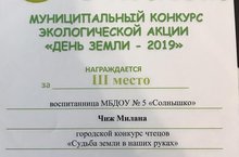 Поздравляем Чиж Милану, занявшую 3 место в городском конкурсе чтецов "Судьба земли в наших руках" в рамках экологической акции "День Земли - 2019".