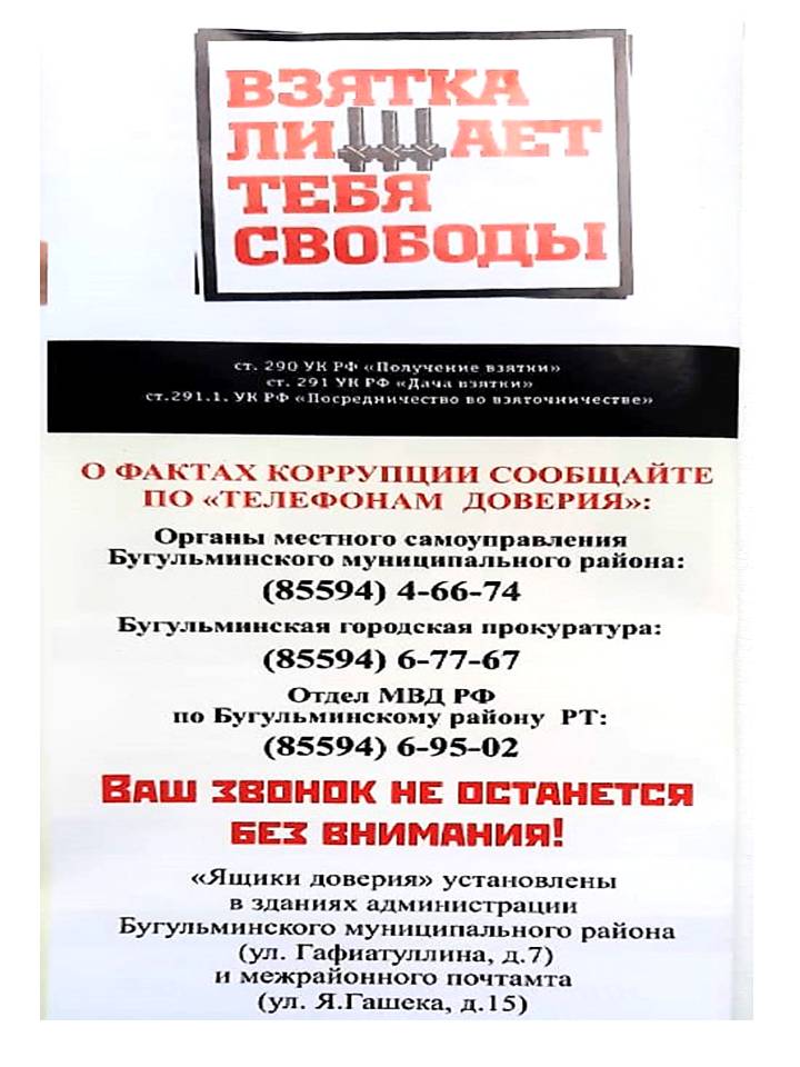 В органах местного самоуправления Бугульминского муниципального района функционирует телефон доверия (4-66-74), позволяющий гражданам сообщать информацию о фактах злоупотребления должностными лицами служебного положения и других проявлениях и нарушениях коррупционной направленности. Информация принимается в будние дни с 7.00 до 19.00 часов, в выходные дни с 7.00 до 17.00 часов.