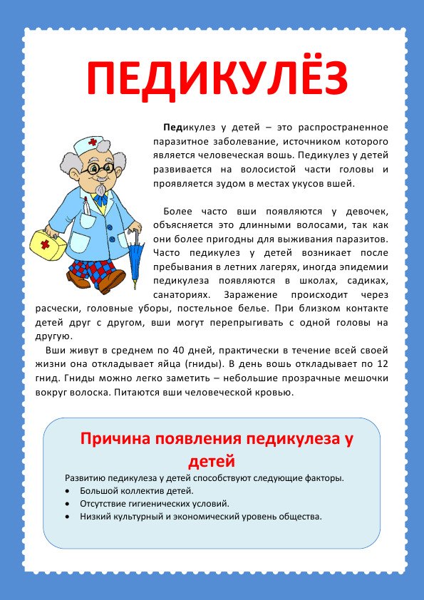Педикулёз - специфическое паразитирование на человеке вшей, питающихся его кровью. Педикулез очень быстро распространяется, особенно у детей из-за близкого контакта и обмена личными вещами. Чаще всего вши появляются на волосистой части головы (головная вошь). Педикулез обычно сопровождается сильным зудом. Вши - маленькие насекомые-паразиты, живущие на коже. Эти насекомые очень раздражают кожу головы, а некоторые из них являются переносчиком тяжелых заболеваний (сыпной тиф). Размножаются вши, откладывая яйца (гниды), которые держатся у корней волос за счет клейких выделений ...подробнее смотреть ЗДЕСЬ