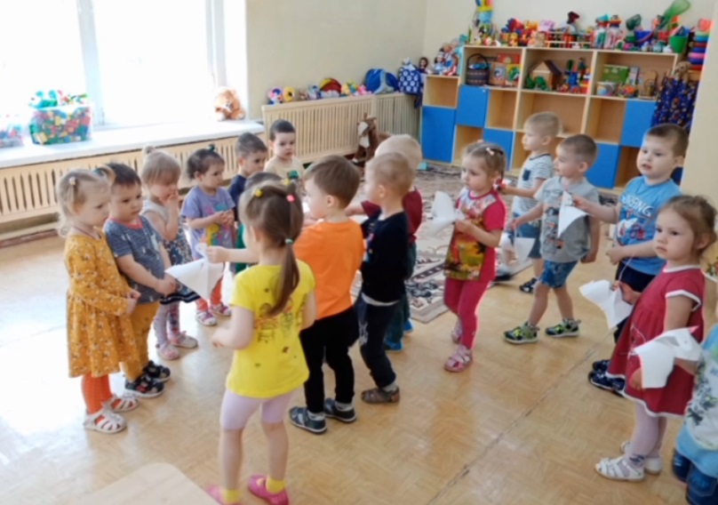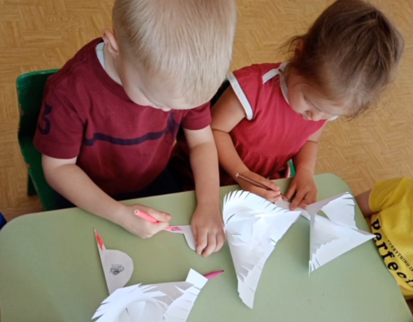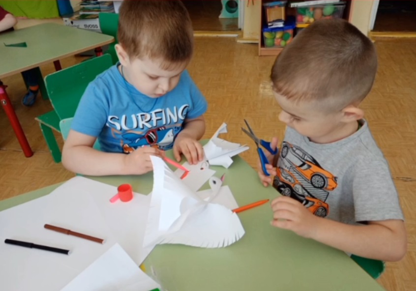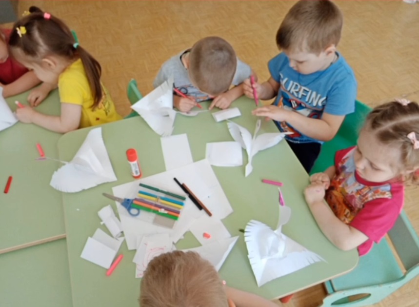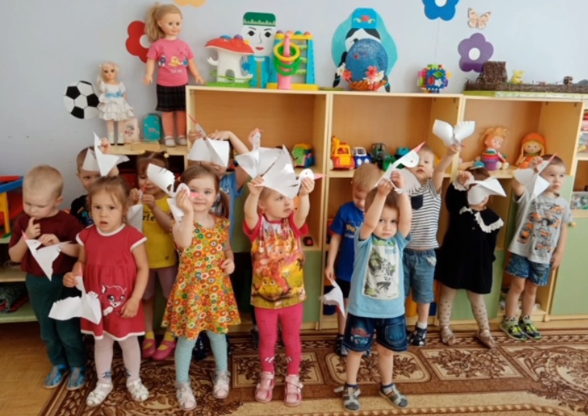 В нашей группе мы организовали творческую мастерскую по подготовке празднования Великой победы. Мы вырезали символы памяти о погибших солдатах — журавлей. Ребята очень старались! И решили подарить этих журавлей малышам из ясельной группы.