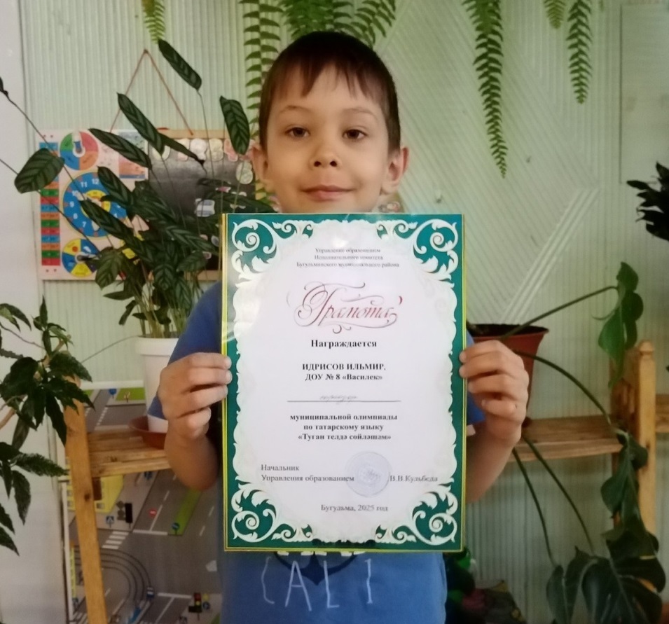 Уже традиционно на базе детского сада № 2 “Батыр” прошла очередная городская олимпиада по татарскому языку для воспитанников 6-7 лет «Туган телдә сөйләшәм», призёром которой стал наш Идрисов Ильмир.