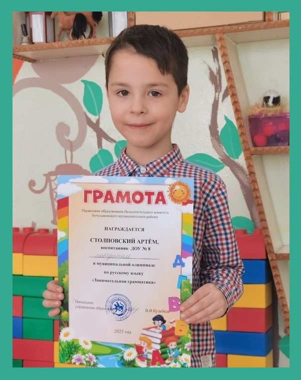 Прошла муниципальная городская олимпиада дошкольников по русскому языку "Занимательная грамматика", где принял участие и получил грамоту победителя наш воспитанник подготовительной к школе группы "Сказка" — Столповский Артём, ставший также победителем и первого тура олимпиады, проходившей среди воспитанников детского сада.