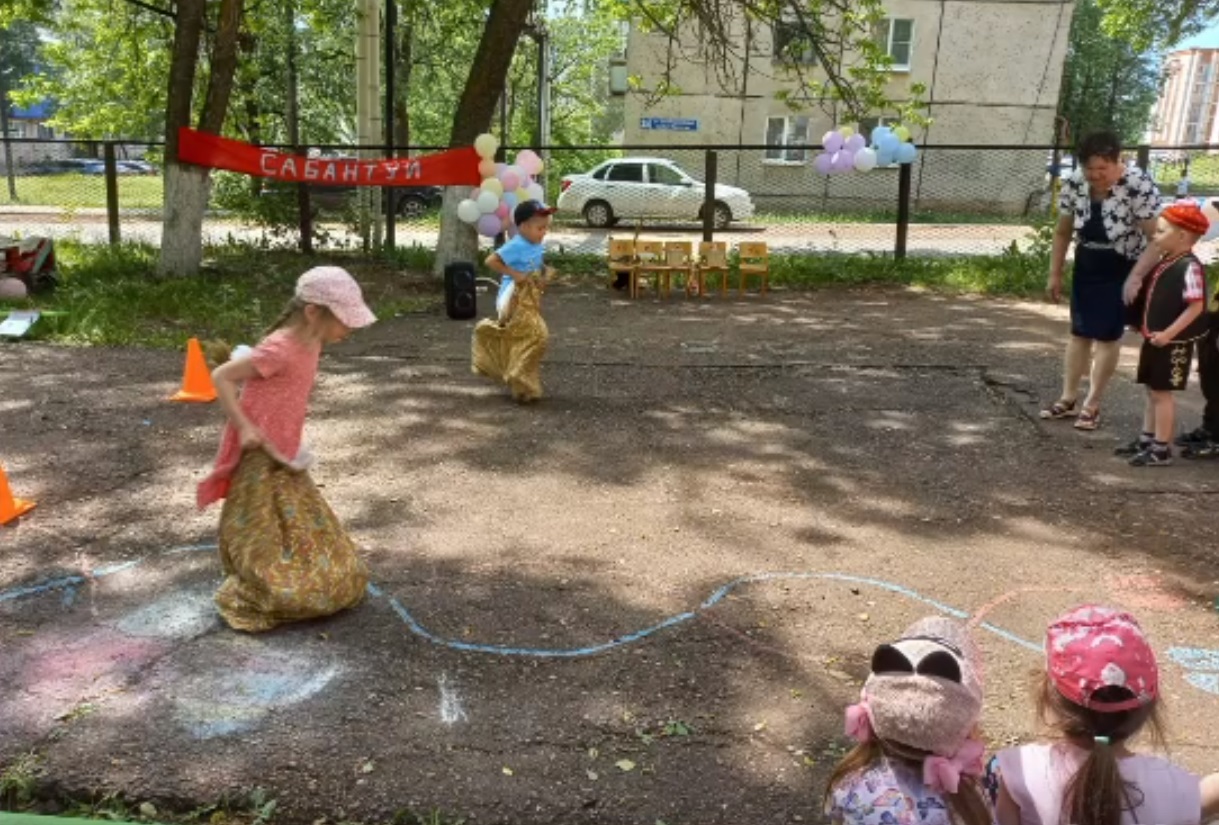 Сегодня в нашем детском саду прошёл традиционный праздник "Сабантуй". Ребята показали свою ловкость и умения в национальных играх "Эх, дружок, продай горшок", "Бег в мешках", "Перенеси яйцо в ложке", "Перетяни канат", "Конные скачки".