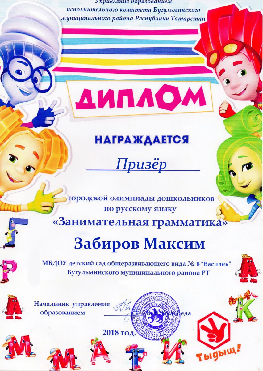 28 февраля на базе МБДОУ № 9 "Колобок" прошла олимпиада дошкольников по русскому языку «Занимательная грамматика», где принял участие и стал призёром наш воспитанник Забиров Максим (подготовительная к школе группа «Сказка», воспитатель Стучалова Ирина Николаевна).