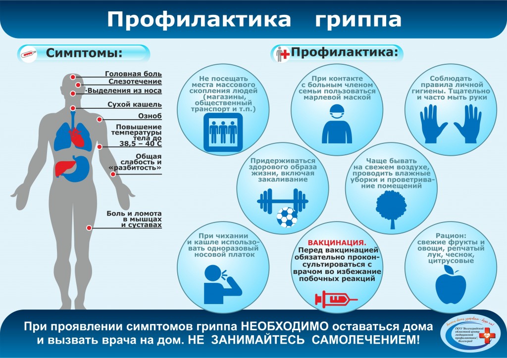 Источником инфекции является больной человек. В период сезона необходимо соблюдать неспецифические меры профилактики гриппа (надевать маску, стараться не посещать места массового скопления людей, чаще мыть руки с мылом, проводить влажную уборку и периодически проветривать помещения).