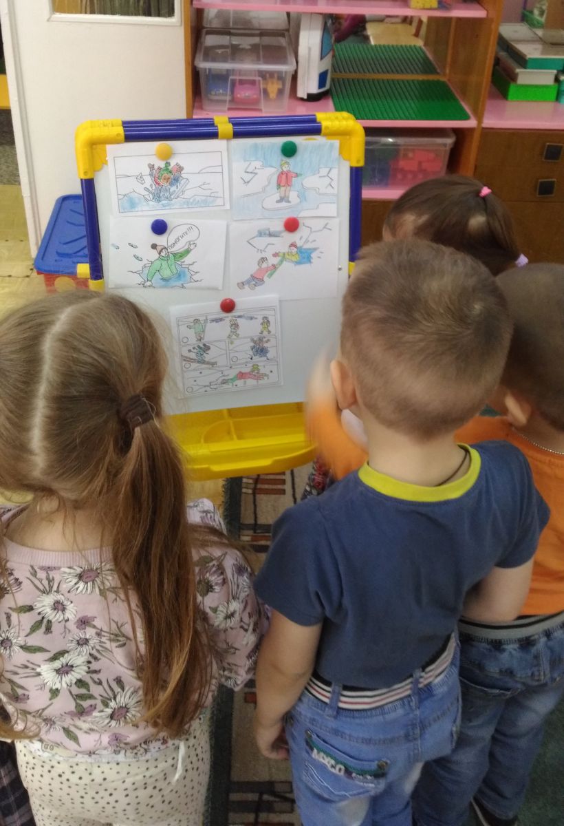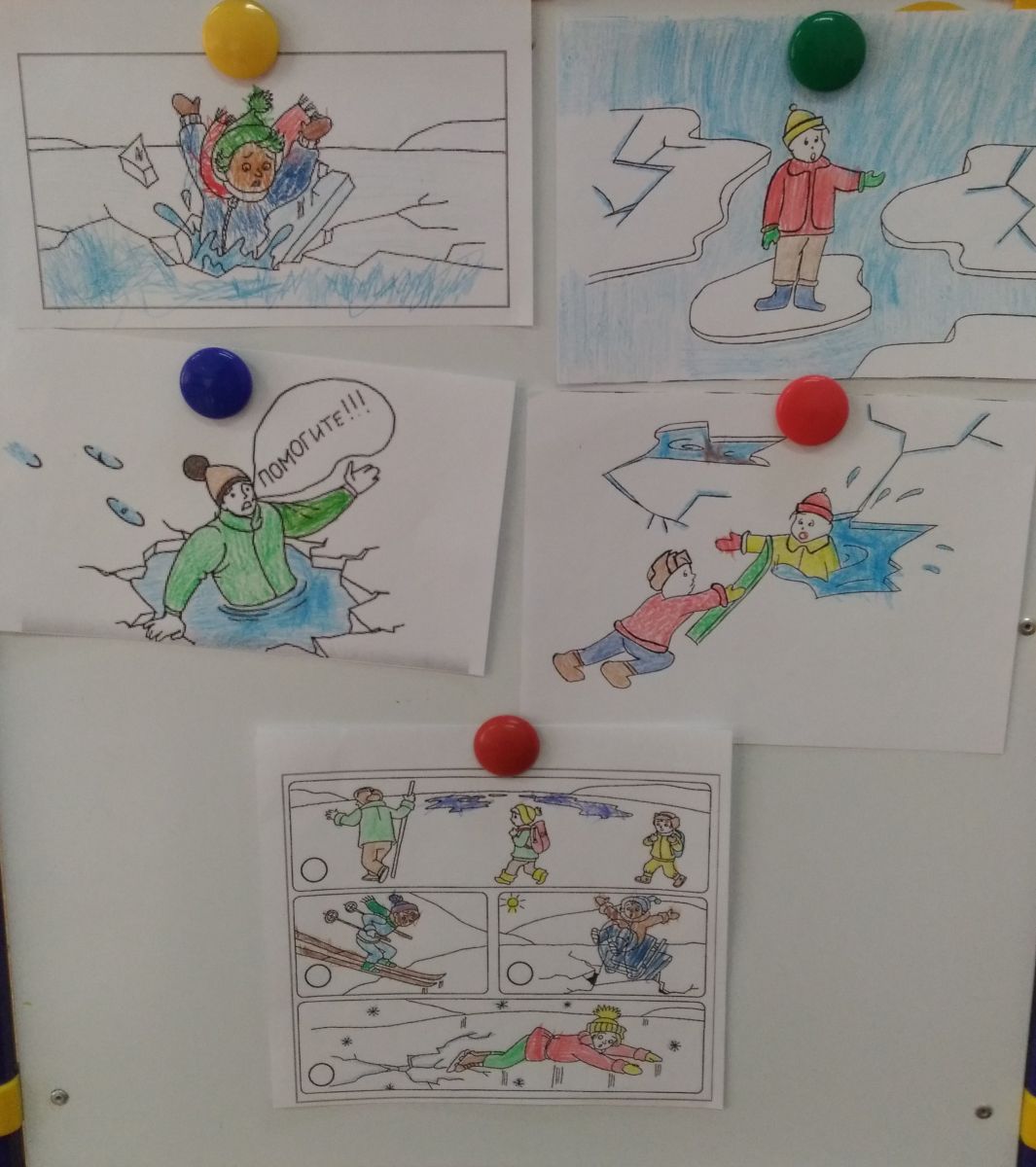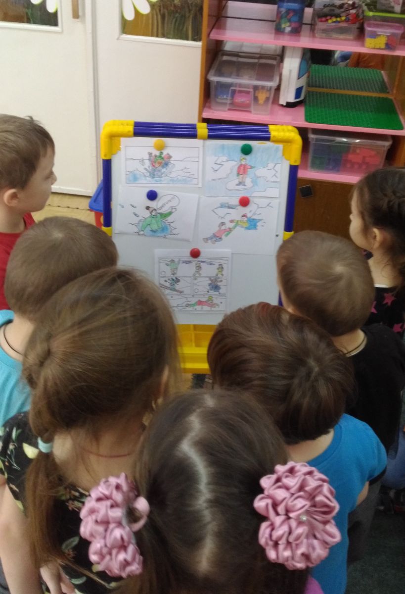 Разыгрывались проблемные ситуации «Тонкий лёд», «Не зная броду, не суйся в воду!», «У воды играем – правила не забываем!», где дети учились, как действовать в ситуации, если ты провалился под лёд. Также воспитанникам были продемонстрированы мультипликационные фильмы по безопасности на льду и даны рекомендации соблюдения правил безопасного поведения у водоёмов во избежание беды.