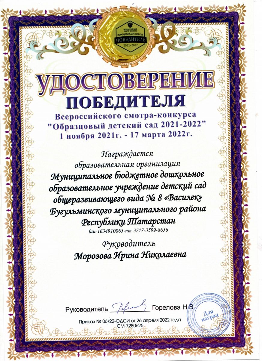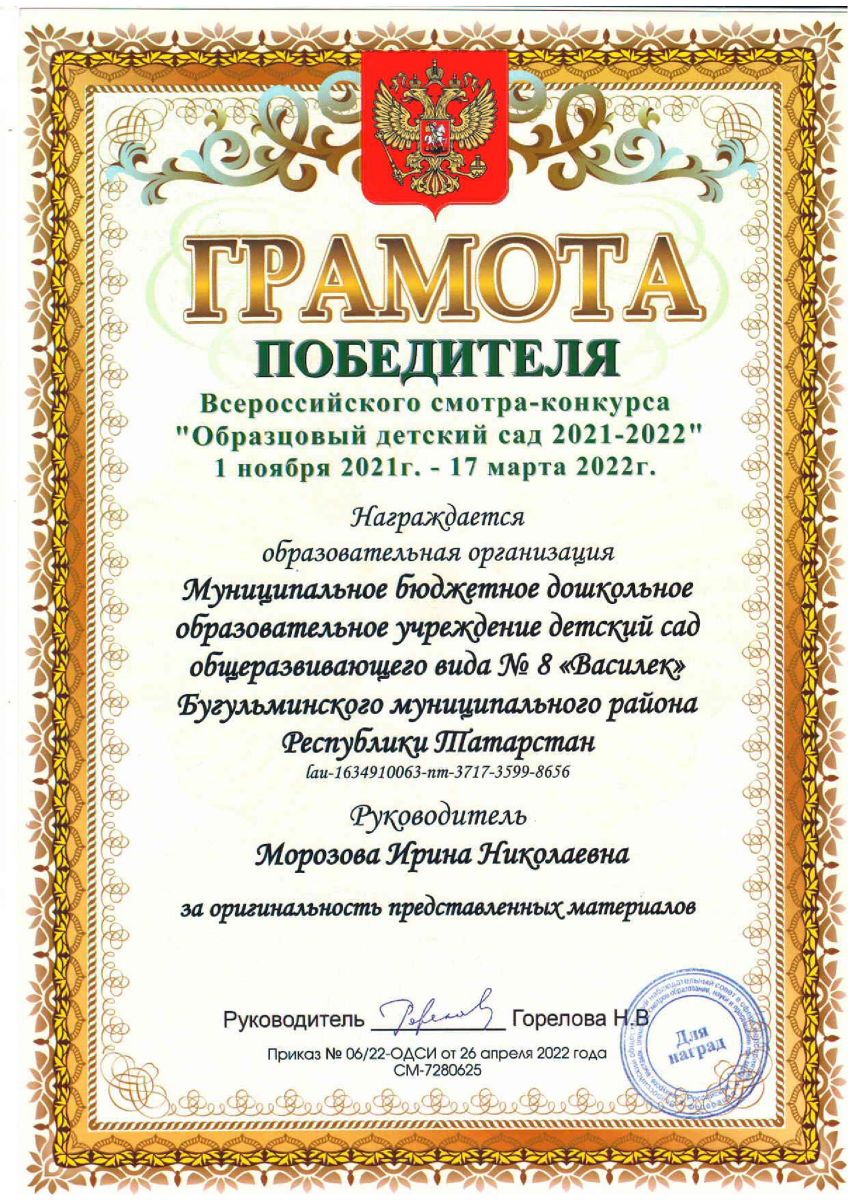 Детский сад — Победитель Всероссийского смотра-конкурса "Образцовый детский сад 2021-2022". Мы удостоились грамоты победителя за оригинальность представленных материалов. Материалы конкурса на специальной виртуальной площадке с 1 ноября 2021 года по 17 марта 2022 года размещали старший воспитатель Заплетаева Наталья Владимировна и воспитатель старшей группы Качурина Кристина Сергеевна.