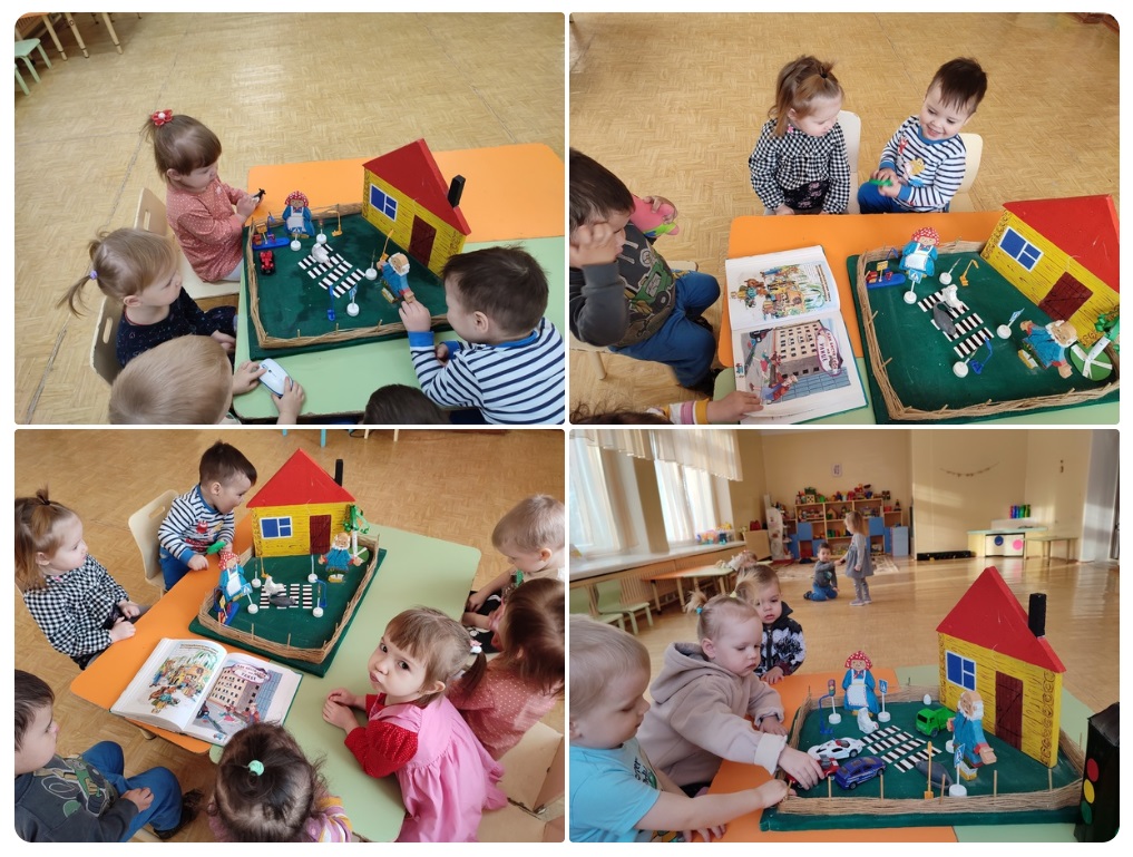 Неделя "Светофорик и я — друзья" началась с первых шагов в страну правил дорожного движения. Используя игровой макет к сказке "Курочка Ряба", малыши познакомились с правилами безопасного перехода через дорогу, а так же учились распознавать сигналы светофора.