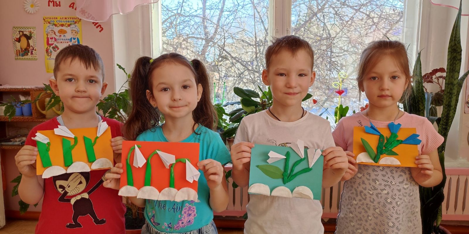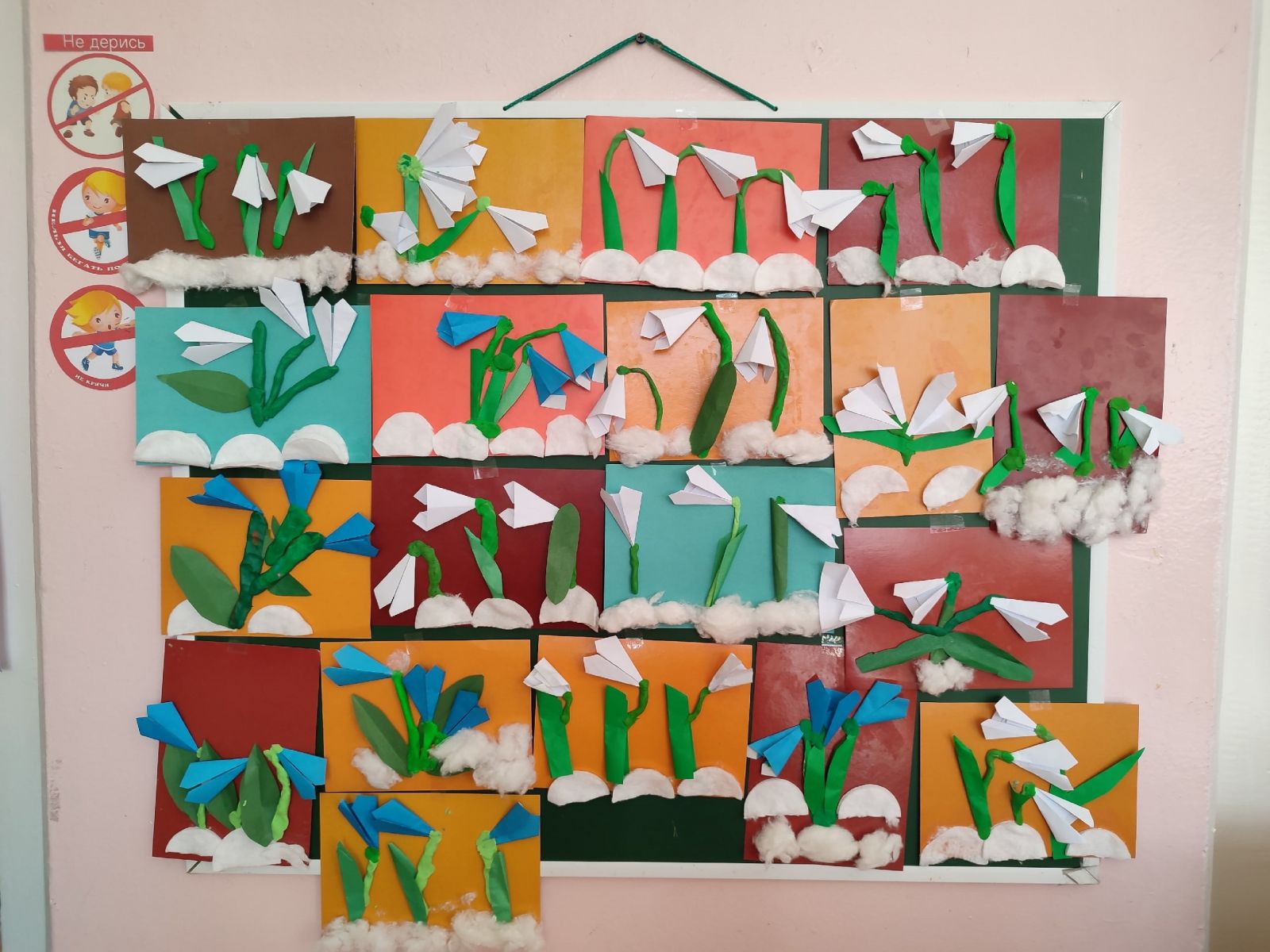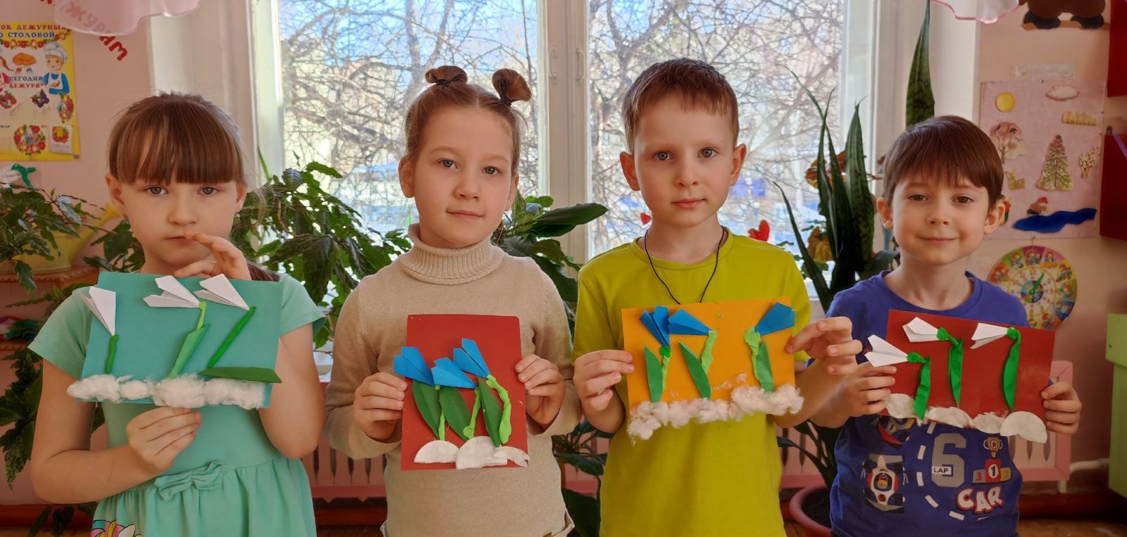 Вот и у нас в группе расцвела полянка подснежников. На занятии по художественному труду дети их мастерили из бумаги способом складывания (оригами), стебельки — из пластилина, а снег — из ваты или ватных дисков. Вот такая яркая полянка у нас!