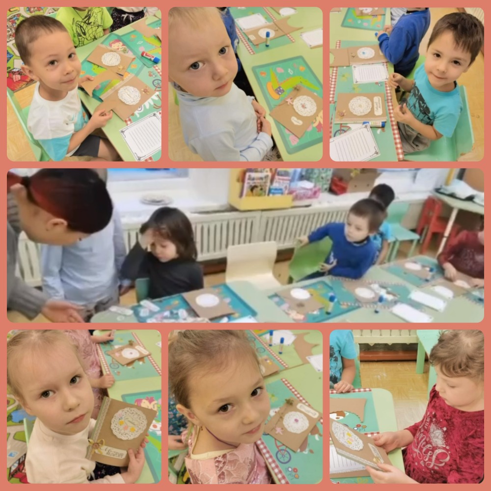 На мастер-классе ребята смогли создать свои уникальные открытки для мам, украсив их лентами, сухоцветами, кружевными салфетками из бумаги