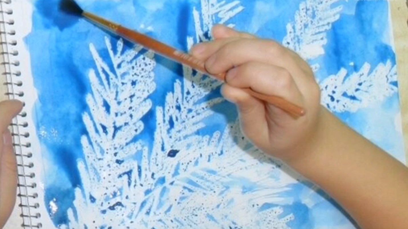 Для создания морозных узоров вам понадобятся восковые мелки или свечка и акварельные краски (можно гуашь). Вначале на бумаге рисуется узор с помощью восковых мелков. Затем к узору добавляется акварельная краска, которая создаёт эффект замёрзшего льда или морозных кристаллов. Попробуйте дома сделать это волшебство! (Смотреть видео!)