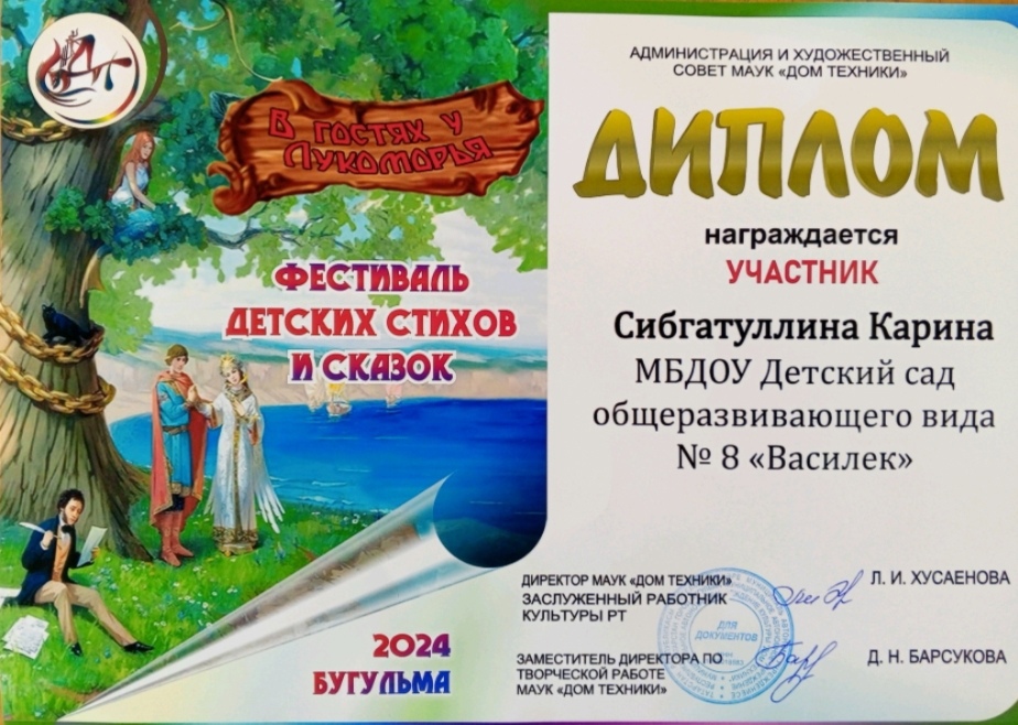 Опубликовано: 23.04.2024Сегодня, 23.04.2024 года, в МАУК "Дом Техники" состоялся фестиваль детских стихов и сказок "В гостях у Лукоморья", посвящённый 225 летию со дня рождения А. С. Пушкина. Наша Сибгатуллина Карина приняла в нём участие: прочитала отрывок из произведения великого русского писателя-поэта "Сказка о мёртвой царевне и семи богатырях".