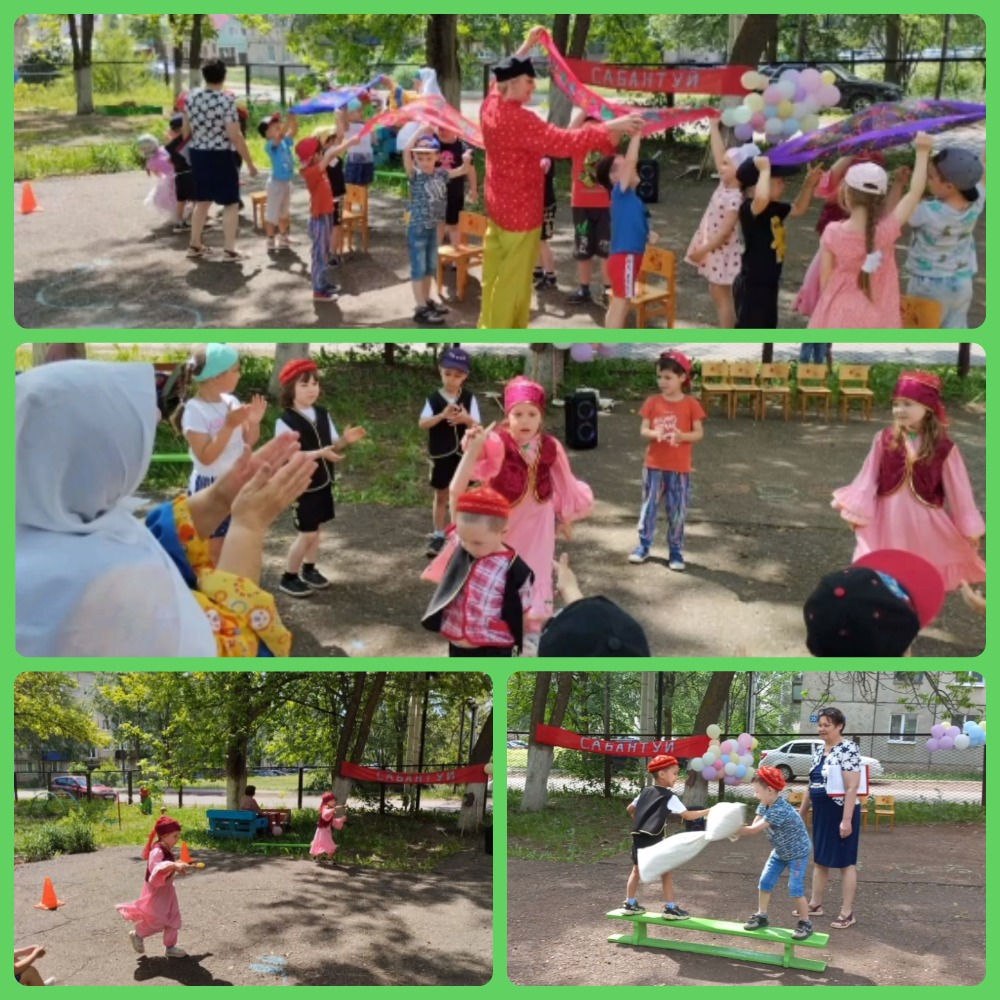 Опубликовано: 07.06.2024Сегодня в нашем детском саду прошёл традиционный праздник "Сабантуй". Весёлое празднование начали с национальных песен и плясок. В празднике приняли участие все дети. Ребята показали свою ловкость и умения в национальных играх "Эх, дружок, продай горшок", "Бег в мешках", "Перенеси яйцо в ложке", "Перетяни канат", "Конные скачки". Самым сложным для ребят оказалось попасть по горшку с закрытыми глазами, но и с этим испытанием они справились! У маленьких участников "Сабантуя" надолго останутся незабываемые впечатления об этом красивом национальном празднике. (Смотреть видео!)