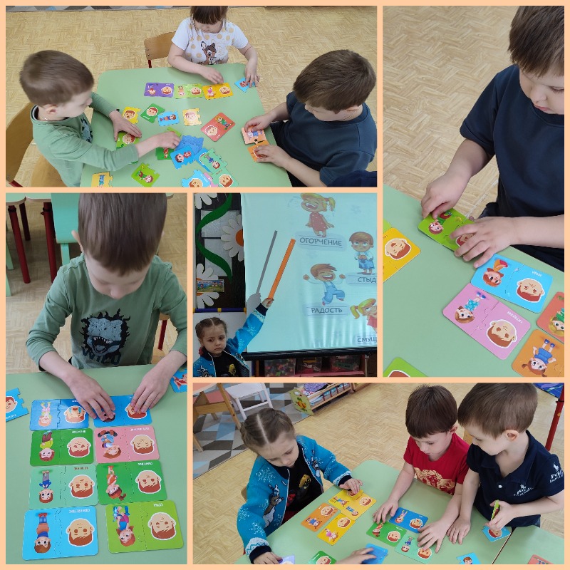 Детям подготовительной к школе группы "Сказка" была предложена игра "Твои эмоции и чувства". Цель игры — развитие эмоционального интеллекта. В игровой форме ребёнок учится распознавать и выражать эмоции и чувства, получает навык оценки моральных качеств. Ход игры - объясни эмоциональное состояние, найди пару.