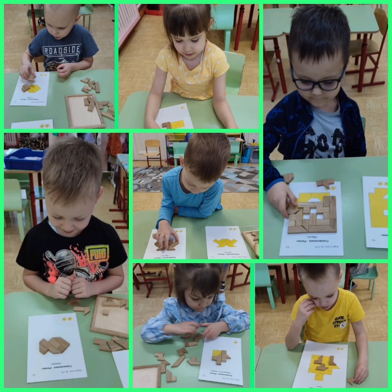 Следующее знакомство ребят с игрой головоломкой "Репка" — это выкладывание силуэтов из геометрических элементов головоломки. (Смотреть видео!)