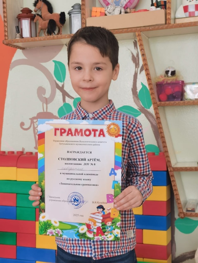 06.03.2025 г. В МБДОУ № 9 "Колобок" состоялась, ставшая уже традиционной, муниципальная городская олимпиада дошкольников по русскому языку "Занимательная грамматика", где принял участие наш воспитанник подготовительной к школе группы "Сказка" — Столповский Артём, который по итогам олимпиады получил грамоту победителя.